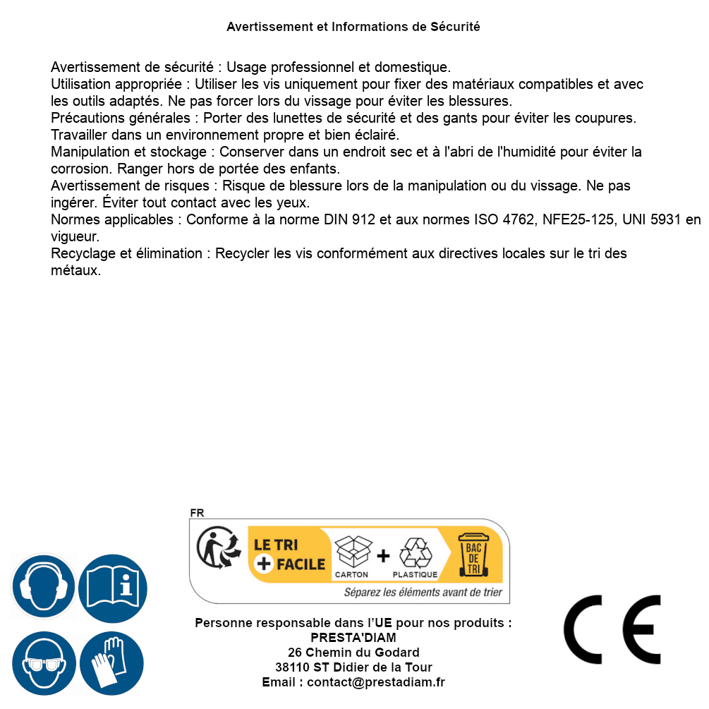 | AVERTISSEMENT et SECURITE | Identification de la personne responsable dans l’UE : Nom : PRESTA'DIAM. Adresse : 26 Chemin du Godard, 38110 ST Didier de la Tour (France). Email : contact@prestadiam.fr. |