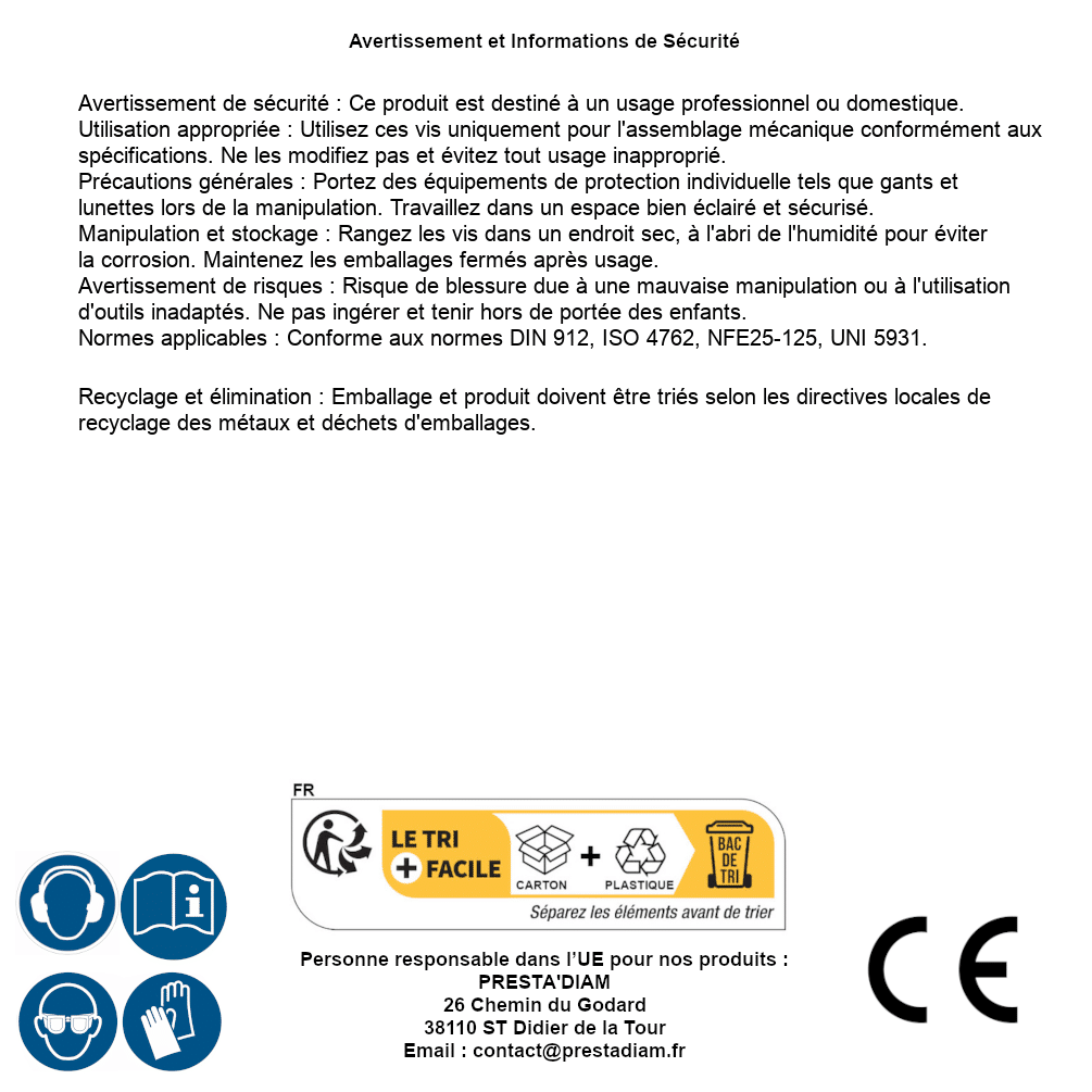 | AVERTISSEMENT et SECURITE | Identification de la personne responsable dans l’UE : Nom : PRESTA'DIAM. Adresse : 26 Chemin du Godard, 38110 ST Didier de la Tour (France). Email : contact@prestadiam.fr. |