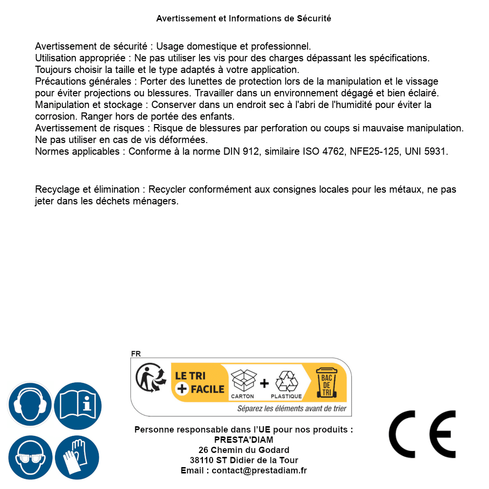 | AVERTISSEMENT et SECURITE | Identification de la personne responsable dans l’UE : Nom : PRESTA'DIAM. Adresse : 26 Chemin du Godard, 38110 ST Didier de la Tour (France). Email : contact@prestadiam.fr. |