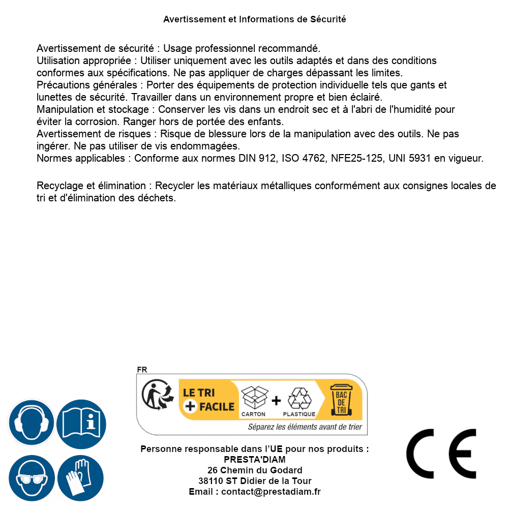 | AVERTISSEMENT et SECURITE | Identification de la personne responsable dans l’UE : Nom : PRESTA'DIAM. Adresse : 26 Chemin du Godard, 38110 ST Didier de la Tour (France). Email : contact@prestadiam.fr. |