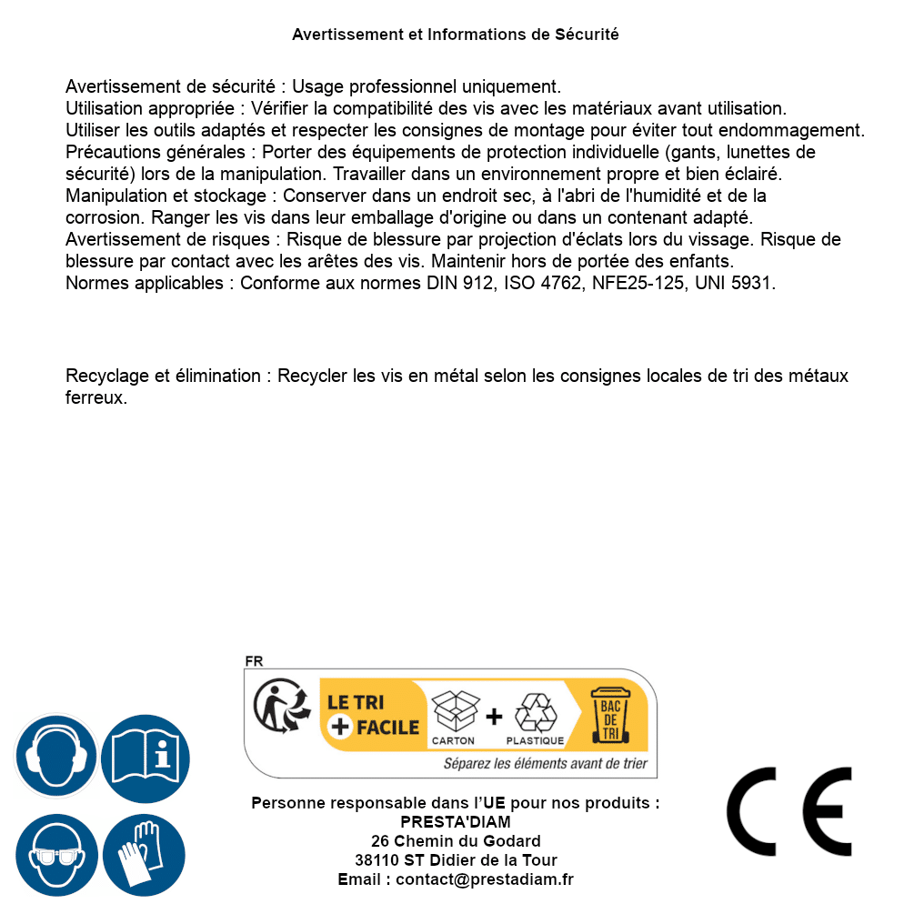 | AVERTISSEMENT et SECURITE | Identification de la personne responsable dans l’UE : Nom : PRESTA'DIAM. Adresse : 26 Chemin du Godard, 38110 ST Didier de la Tour (France). Email : contact@prestadiam.fr. |