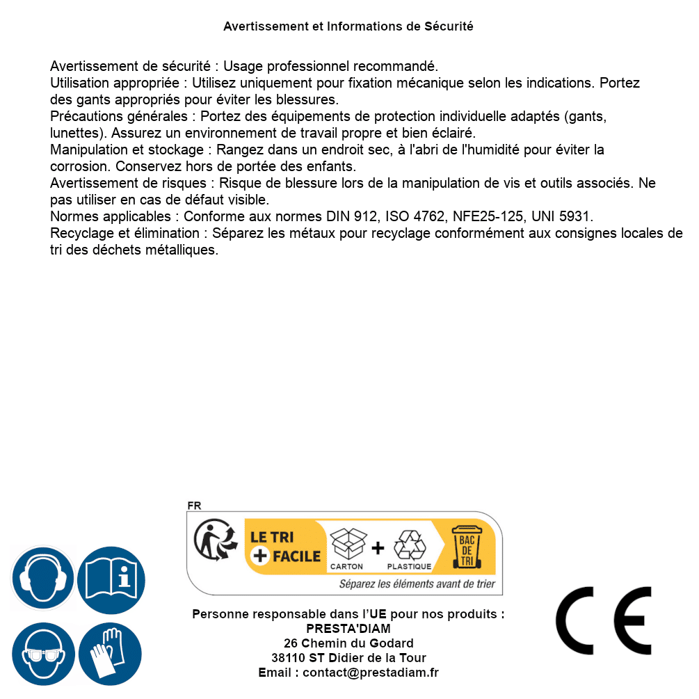 | AVERTISSEMENT et SECURITE | Identification de la personne responsable dans l’UE : Nom : PRESTA'DIAM. Adresse : 26 Chemin du Godard, 38110 ST Didier de la Tour (France). Email : contact@prestadiam.fr. |