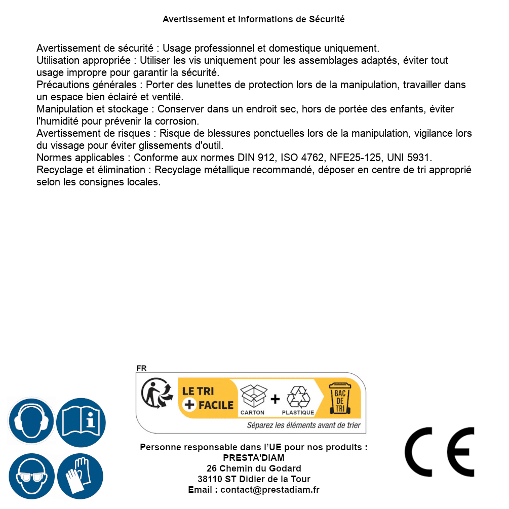 | AVERTISSEMENT et SECURITE | Identification de la personne responsable dans l’UE : Nom : PRESTA'DIAM. Adresse : 26 Chemin du Godard, 38110 ST Didier de la Tour (France). Email : contact@prestadiam.fr. |