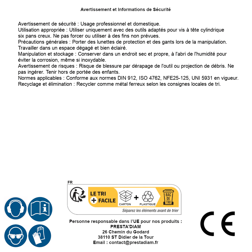 | AVERTISSEMENT et SECURITE | Identification de la personne responsable dans l’UE : Nom : PRESTA'DIAM. Adresse : 26 Chemin du Godard, 38110 ST Didier de la Tour (France). Email : contact@prestadiam.fr. |