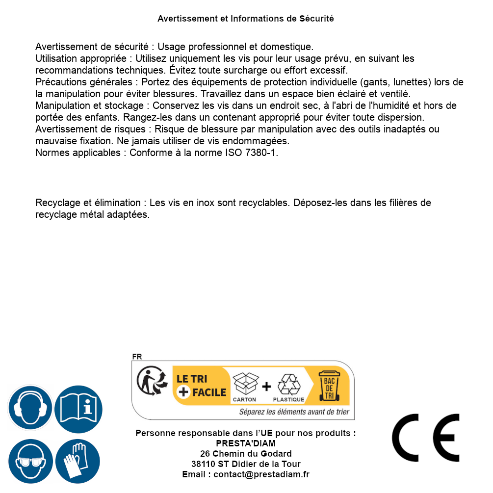 | AVERTISSEMENT et SECURITE | Identification de la personne responsable dans l’UE : Nom : PRESTA'DIAM. Adresse : 26 Chemin du Godard, 38110 ST Didier de la Tour (France). Email : contact@prestadiam.fr. |