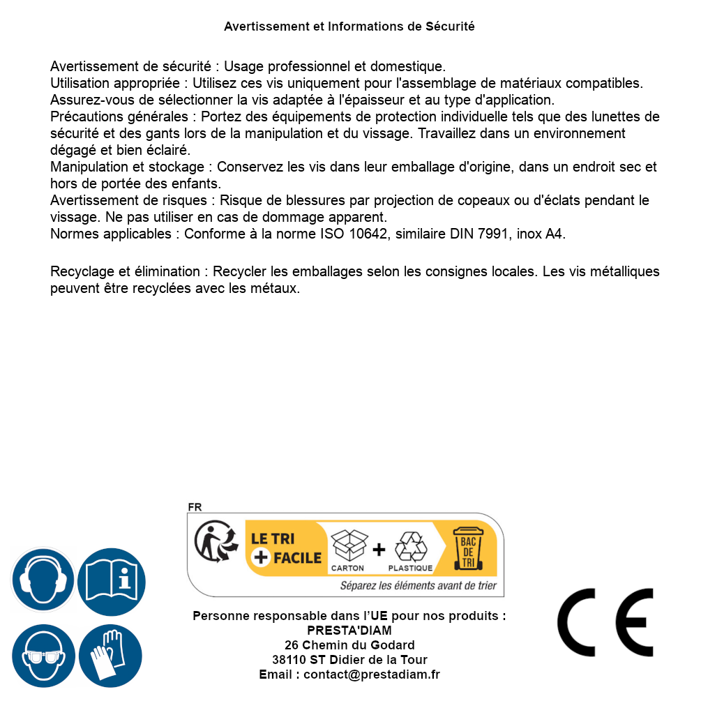 | AVERTISSEMENT et SECURITE | Identification de la personne responsable dans l’UE : Nom : PRESTA'DIAM. Adresse : 26 Chemin du Godard, 38110 ST Didier de la Tour (France). Email : contact@prestadiam.fr. |