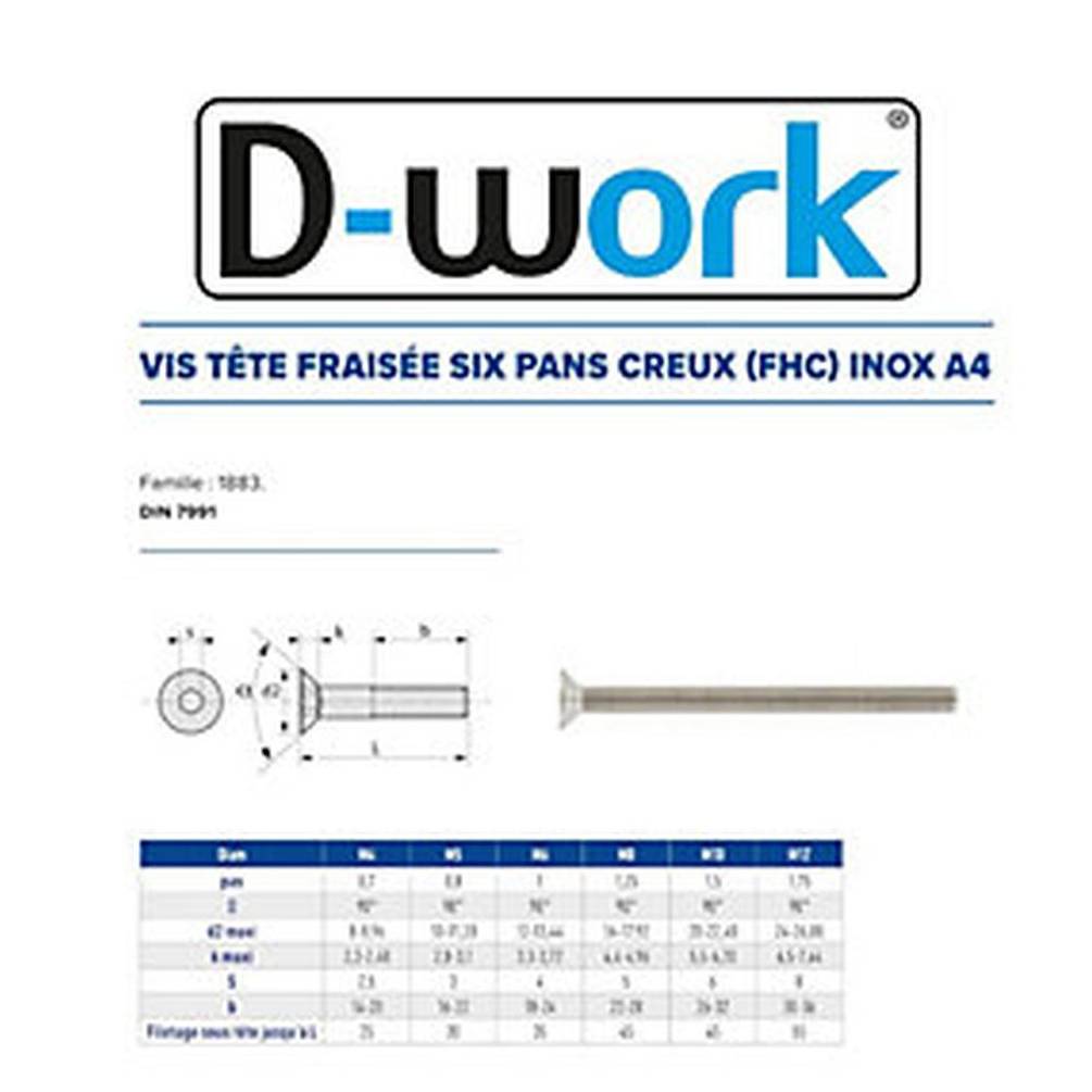 Ref. ACT-642036X80En savoir + sur 100 Vis à Métaux Tête Fraisée Six Pans Creux 6 x 80 mm - ISO 10642 - DIN 7991 - Inox A4 - D-Work