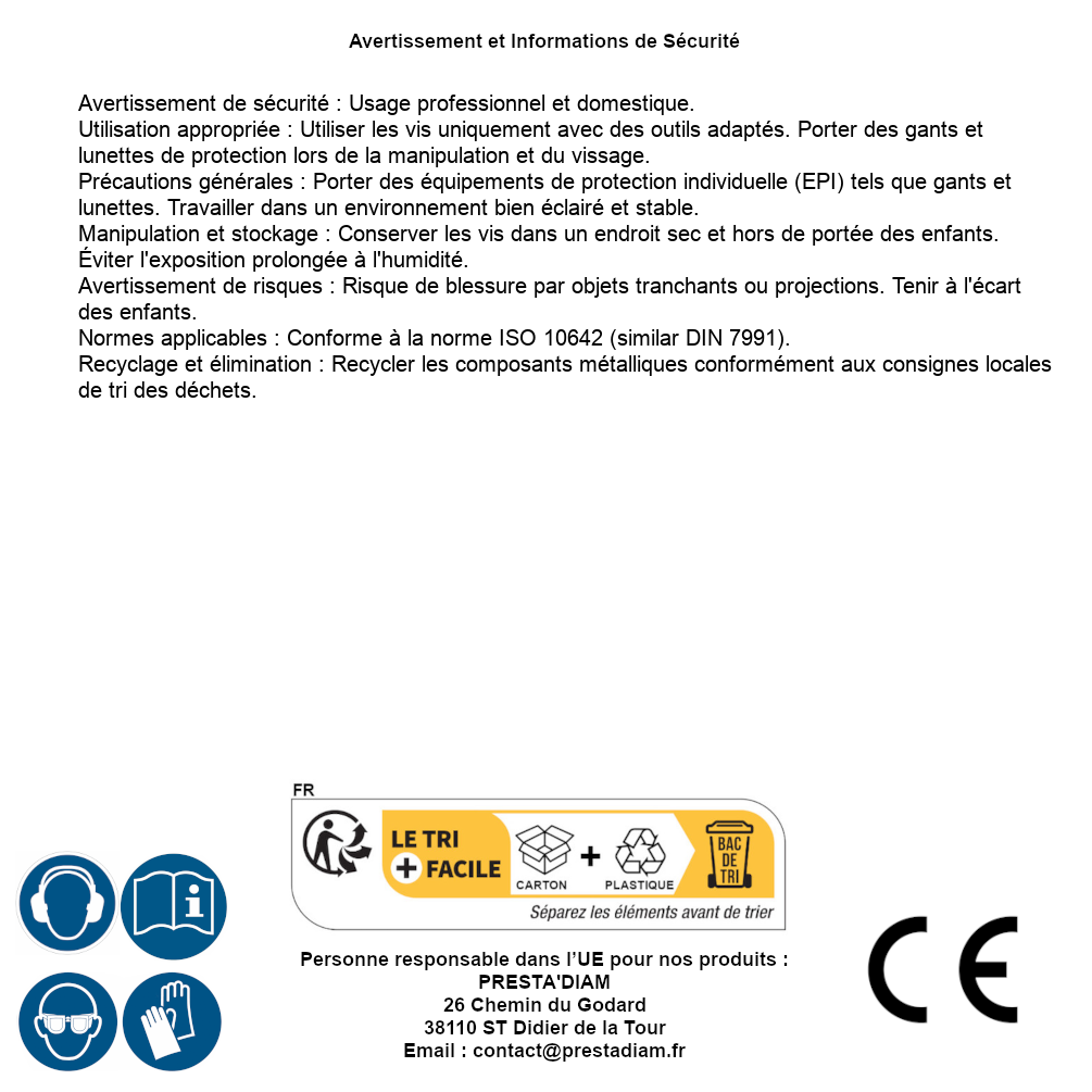 | AVERTISSEMENT et SECURITE | Identification de la personne responsable dans l’UE : Nom : PRESTA'DIAM. Adresse : 26 Chemin du Godard, 38110 ST Didier de la Tour (France). Email : contact@prestadiam.fr. |