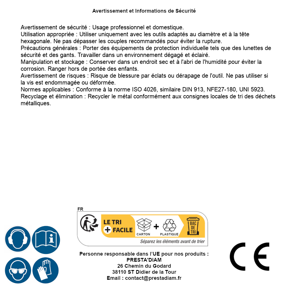 | AVERTISSEMENT et SECURITE | Identification de la personne responsable dans l’UE : Nom : PRESTA'DIAM. Adresse : 26 Chemin du Godard, 38110 ST Didier de la Tour (France). Email : contact@prestadiam.fr. |