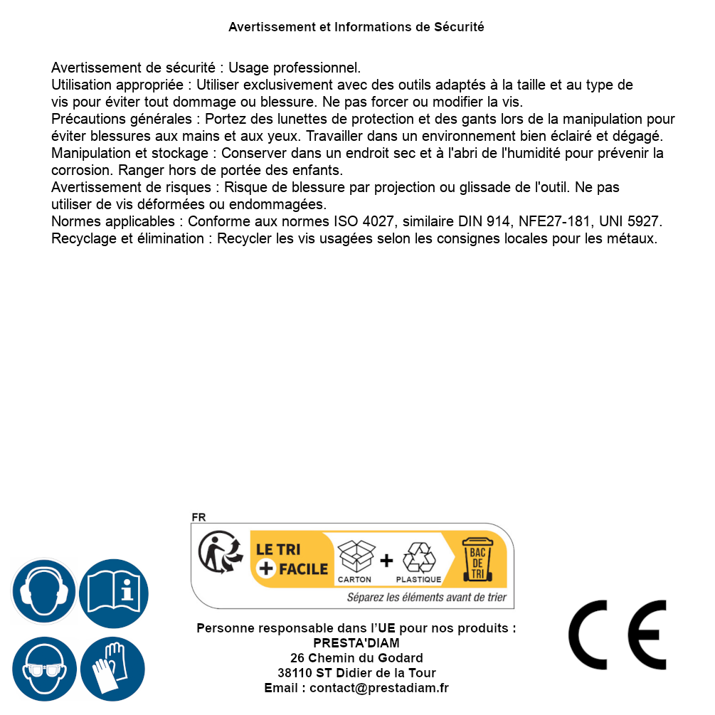 | AVERTISSEMENT et SECURITE | Identification de la personne responsable dans l’UE : Nom : PRESTA'DIAM. Adresse : 26 Chemin du Godard, 38110 ST Didier de la Tour (France). Email : contact@prestadiam.fr. |