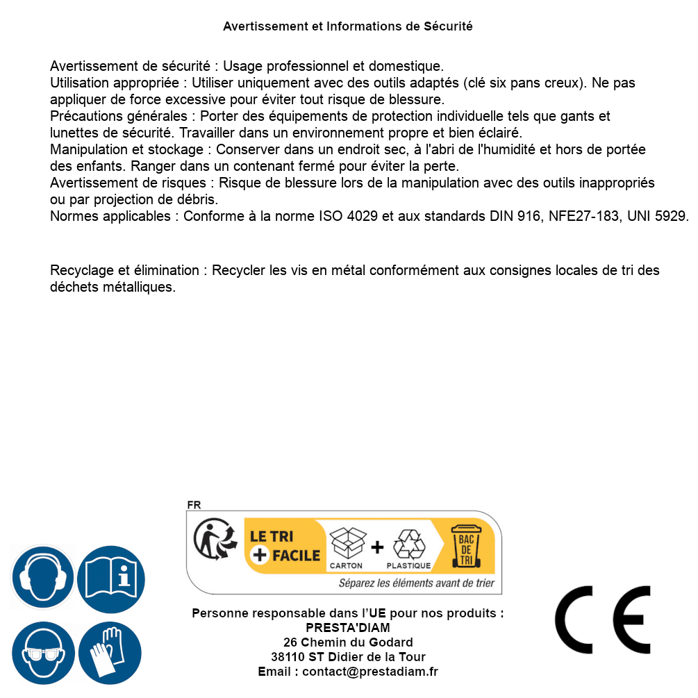 | AVERTISSEMENT et SECURITE | Identification de la personne responsable dans l’UE : Nom : PRESTA'DIAM. Adresse : 26 Chemin du Godard, 38110 ST Didier de la Tour (France). Email : contact@prestadiam.fr. |