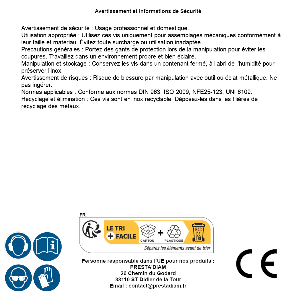 | AVERTISSEMENT et SECURITE | Identification de la personne responsable dans l’UE : Nom : PRESTA'DIAM. Adresse : 26 Chemin du Godard, 38110 ST Didier de la Tour (France). Email : contact@prestadiam.fr. |