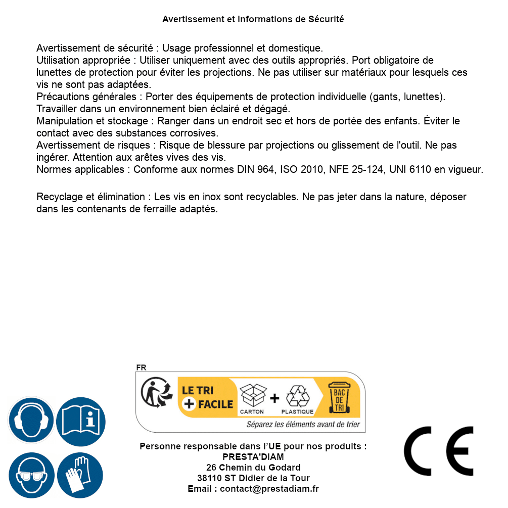 | AVERTISSEMENT et SECURITE | Identification de la personne responsable dans l’UE : Nom : PRESTA'DIAM. Adresse : 26 Chemin du Godard, 38110 ST Didier de la Tour (France). Email : contact@prestadiam.fr. |