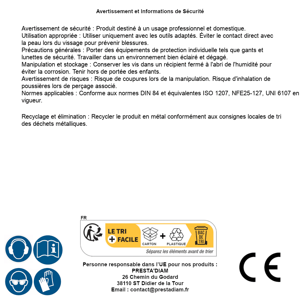 | AVERTISSEMENT et SECURITE | Identification de la personne responsable dans l’UE : Nom : PRESTA'DIAM. Adresse : 26 Chemin du Godard, 38110 ST Didier de la Tour (France). Email : contact@prestadiam.fr. |
