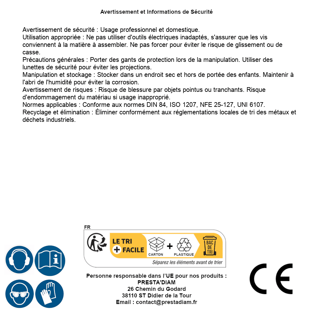| AVERTISSEMENT et SECURITE | Identification de la personne responsable dans l’UE : Nom : PRESTA'DIAM. Adresse : 26 Chemin du Godard, 38110 ST Didier de la Tour (France). Email : contact@prestadiam.fr. |