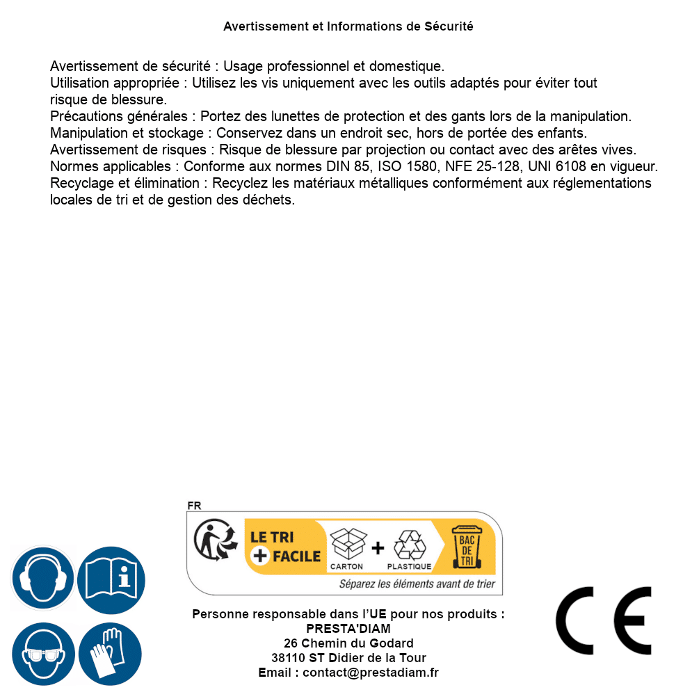 | AVERTISSEMENT et SECURITE | Identification de la personne responsable dans l’UE : Nom : PRESTA'DIAM. Adresse : 26 Chemin du Godard, 38110 ST Didier de la Tour (France). Email : contact@prestadiam.fr. |