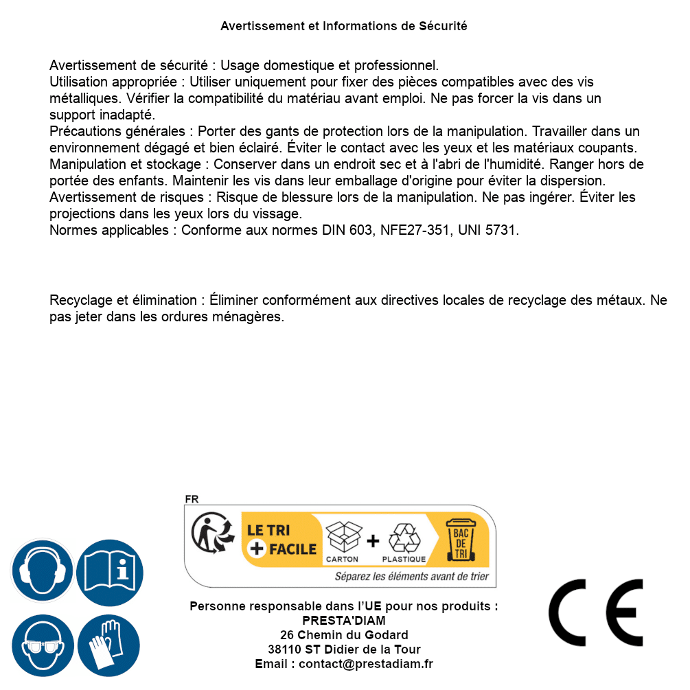 | AVERTISSEMENT et SECURITE | Identification de la personne responsable dans l’UE : Nom : PRESTA'DIAM. Adresse : 26 Chemin du Godard, 38110 ST Didier de la Tour (France). Email : contact@prestadiam.fr. |