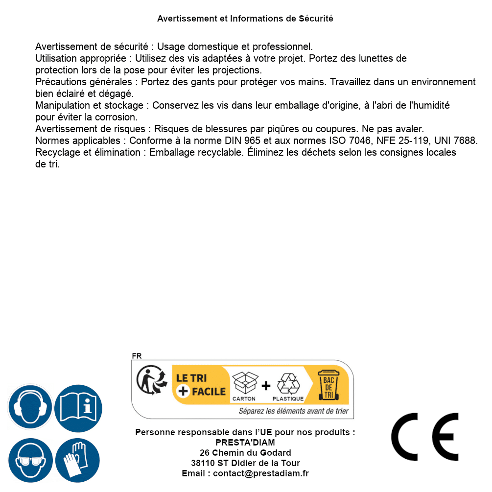 | AVERTISSEMENT et SECURITE | Identification de la personne responsable dans l’UE : Nom : PRESTA'DIAM. Adresse : 26 Chemin du Godard, 38110 ST Didier de la Tour (France). Email : contact@prestadiam.fr. |