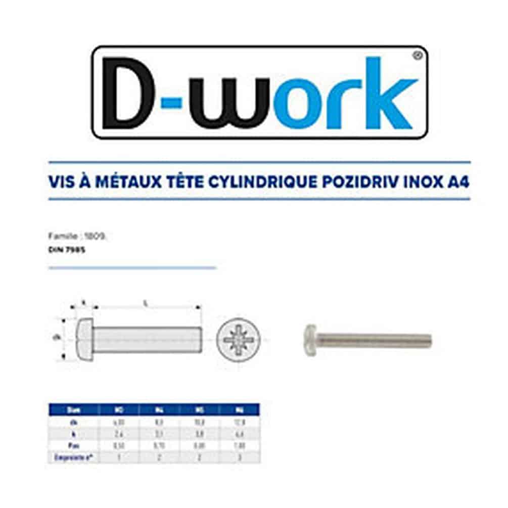 Ref. ACT-642162X4En savoir + sur 500 Vis à Métaux Tête Cylindrique Pozidriv 2 x 4 mm - DIN 7985 - ISO 7045 - NFE25-121 - UNI 7687 - Inox A4 - D-Work