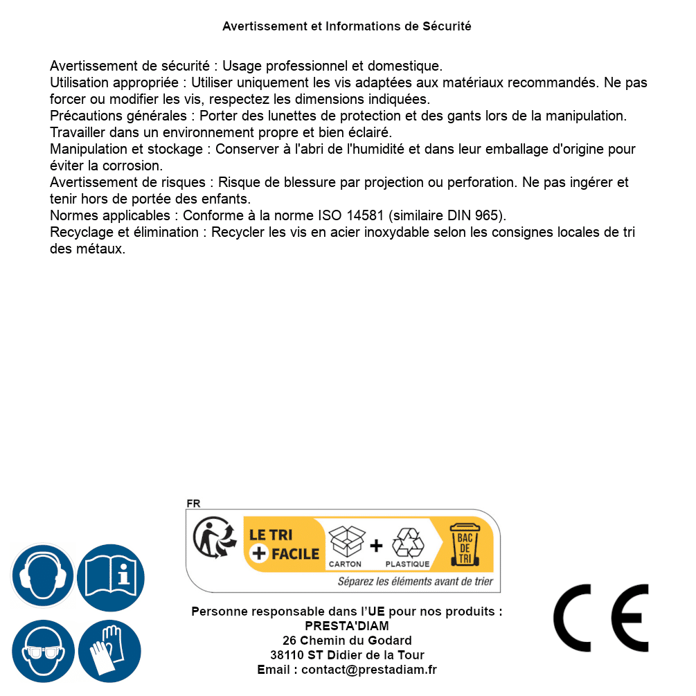 | AVERTISSEMENT et SECURITE | Identification de la personne responsable dans l’UE : Nom : PRESTA'DIAM. Adresse : 26 Chemin du Godard, 38110 ST Didier de la Tour (France). Email : contact@prestadiam.fr. |