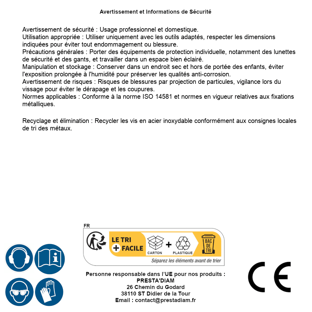 | AVERTISSEMENT et SECURITE | Identification de la personne responsable dans l’UE : Nom : PRESTA'DIAM. Adresse : 26 Chemin du Godard, 38110 ST Didier de la Tour (France). Email : contact@prestadiam.fr. |