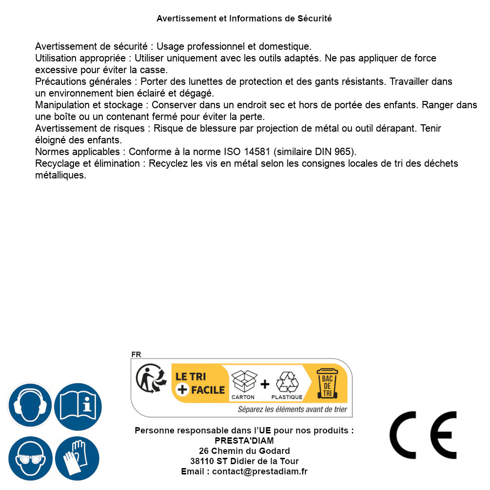 | AVERTISSEMENT et SECURITE | Identification de la personne responsable dans l’UE : Nom : PRESTA'DIAM. Adresse : 26 Chemin du Godard, 38110 ST Didier de la Tour (France). Email : contact@prestadiam.fr. |