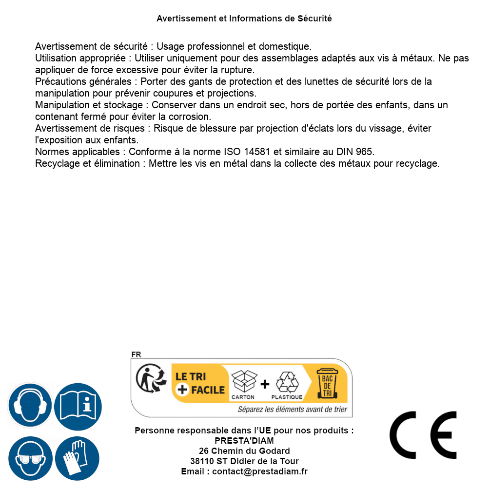 | AVERTISSEMENT et SECURITE | Identification de la personne responsable dans l’UE : Nom : PRESTA'DIAM. Adresse : 26 Chemin du Godard, 38110 ST Didier de la Tour (France). Email : contact@prestadiam.fr. |