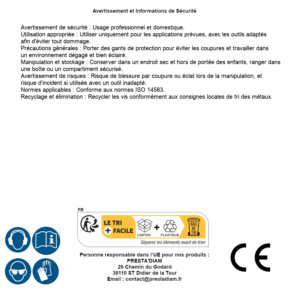 | AVERTISSEMENT et SECURITE | Identification de la personne responsable dans l’UE : Nom : PRESTA'DIAM. Adresse : 26 Chemin du Godard, 38110 ST Didier de la Tour (France). Email : contact@prestadiam.fr. |