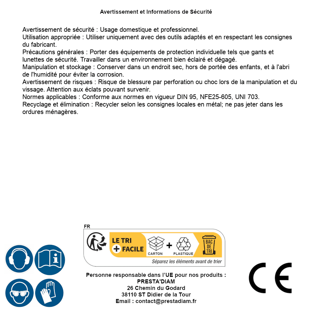 | AVERTISSEMENT et SECURITE | Identification de la personne responsable dans l’UE : Nom : PRESTA'DIAM. Adresse : 26 Chemin du Godard, 38110 ST Didier de la Tour (France). Email : contact@prestadiam.fr. |