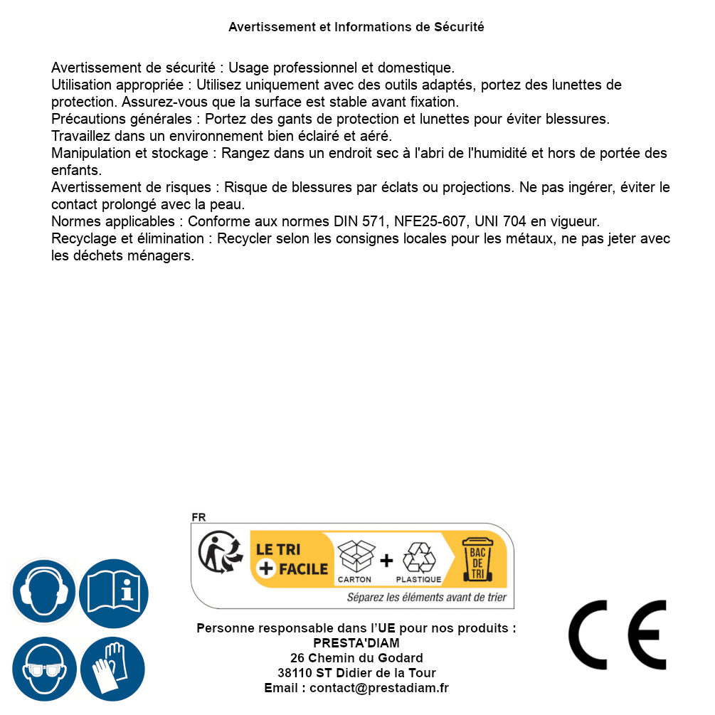 | AVERTISSEMENT et SECURITE | Identification de la personne responsable dans l’UE : Nom : PRESTA'DIAM. Adresse : 26 Chemin du Godard, 38110 ST Didier de la Tour (France). Email : contact@prestadiam.fr. |