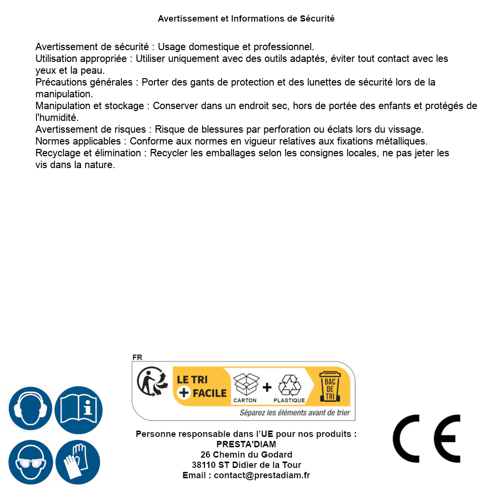 | AVERTISSEMENT et SECURITE | Identification de la personne responsable dans l’UE : Nom : PRESTA'DIAM. Adresse : 26 Chemin du Godard, 38110 ST Didier de la Tour (France). Email : contact@prestadiam.fr. |