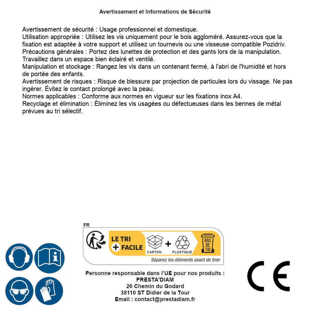 | AVERTISSEMENT et SECURITE | Identification de la personne responsable dans l’UE : Nom : PRESTA'DIAM. Adresse : 26 Chemin du Godard, 38110 ST Didier de la Tour (France). Email : contact@prestadiam.fr. |