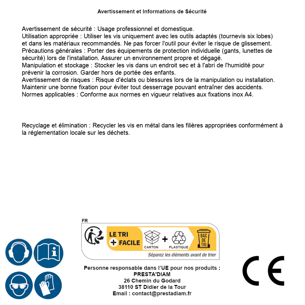 | AVERTISSEMENT et SECURITE | Identification de la personne responsable dans l’UE : Nom : PRESTA'DIAM. Adresse : 26 Chemin du Godard, 38110 ST Didier de la Tour (France). Email : contact@prestadiam.fr. |