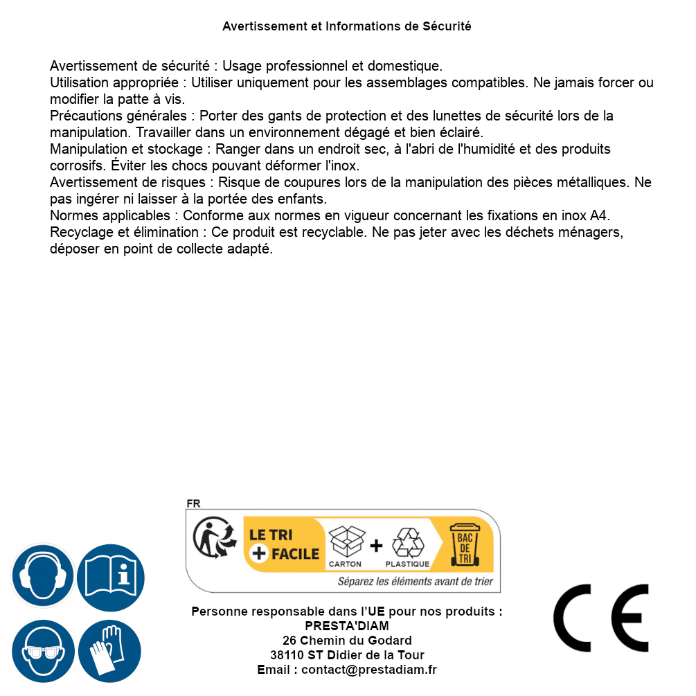 | AVERTISSEMENT et SECURITE | Identification de la personne responsable dans l’UE : Nom : PRESTA'DIAM. Adresse : 26 Chemin du Godard, 38110 ST Didier de la Tour (France). Email : contact@prestadiam.fr. |