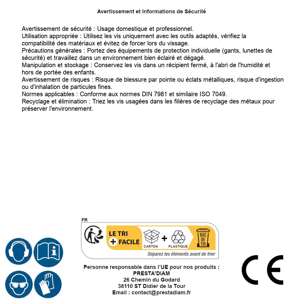 | AVERTISSEMENT et SECURITE | Identification de la personne responsable dans l’UE : Nom : PRESTA'DIAM. Adresse : 26 Chemin du Godard, 38110 ST Didier de la Tour (France). Email : contact@prestadiam.fr. |
