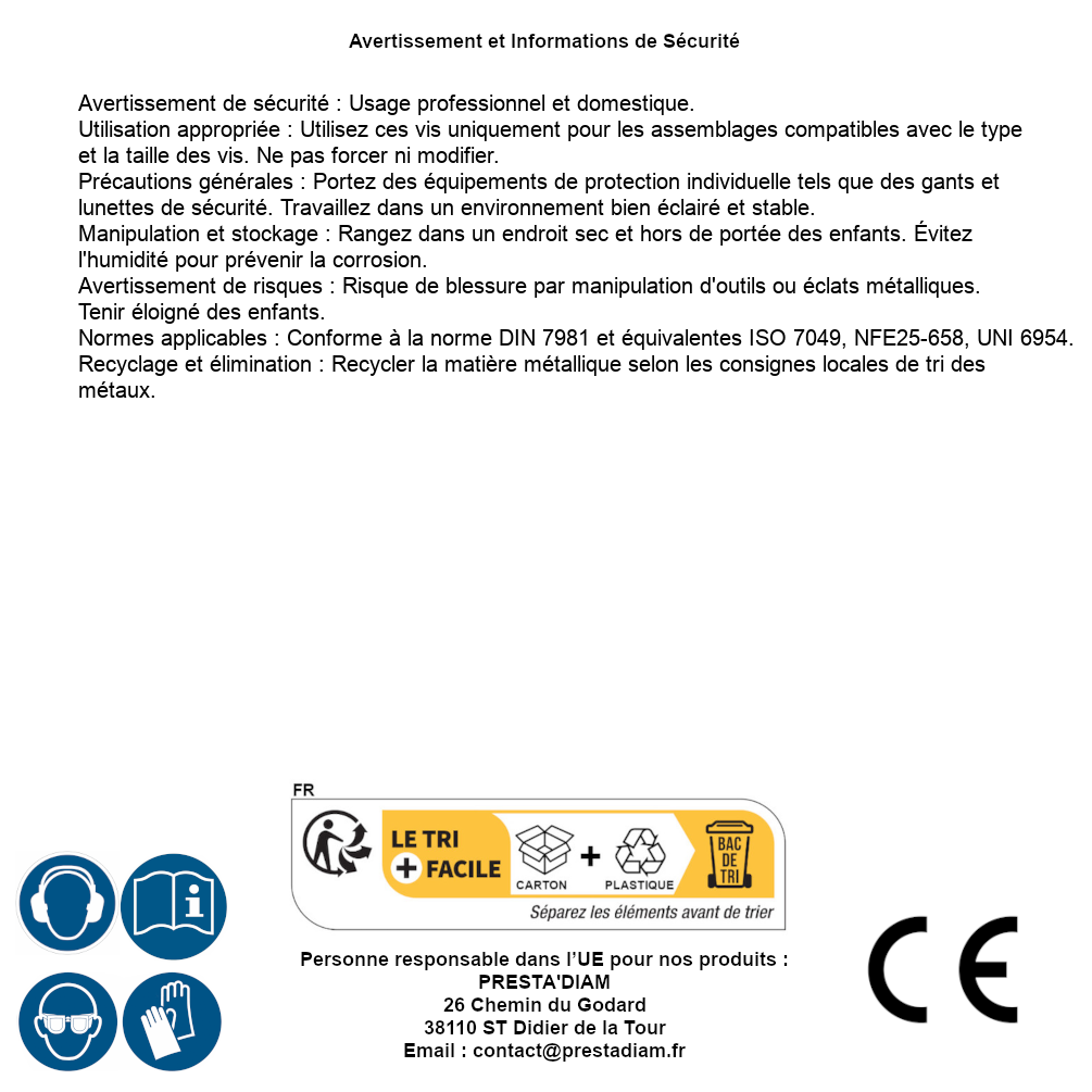 | AVERTISSEMENT et SECURITE | Identification de la personne responsable dans l’UE : Nom : PRESTA'DIAM. Adresse : 26 Chemin du Godard, 38110 ST Didier de la Tour (France). Email : contact@prestadiam.fr. |