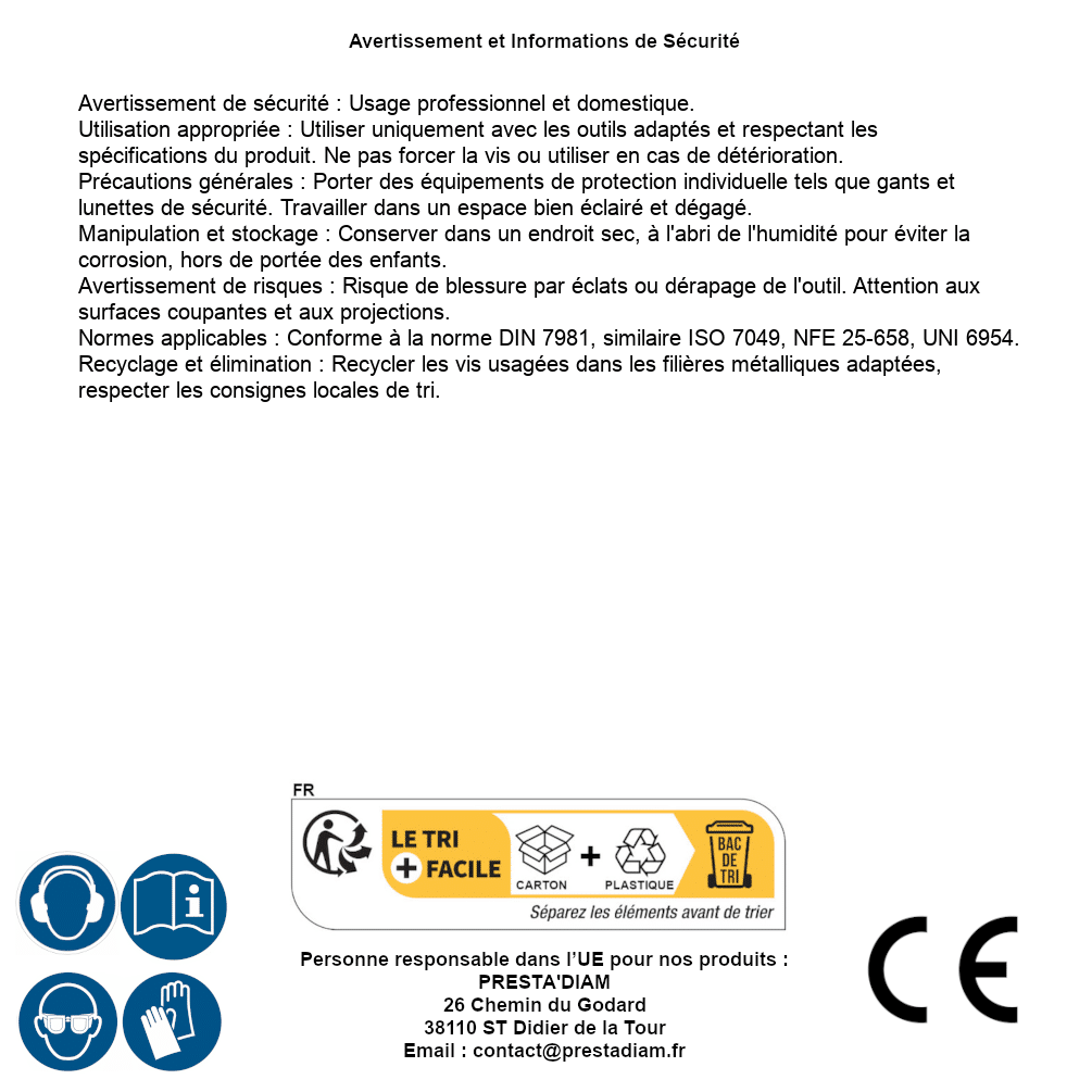 | AVERTISSEMENT et SECURITE | Identification de la personne responsable dans l’UE : Nom : PRESTA'DIAM. Adresse : 26 Chemin du Godard, 38110 ST Didier de la Tour (France). Email : contact@prestadiam.fr. |