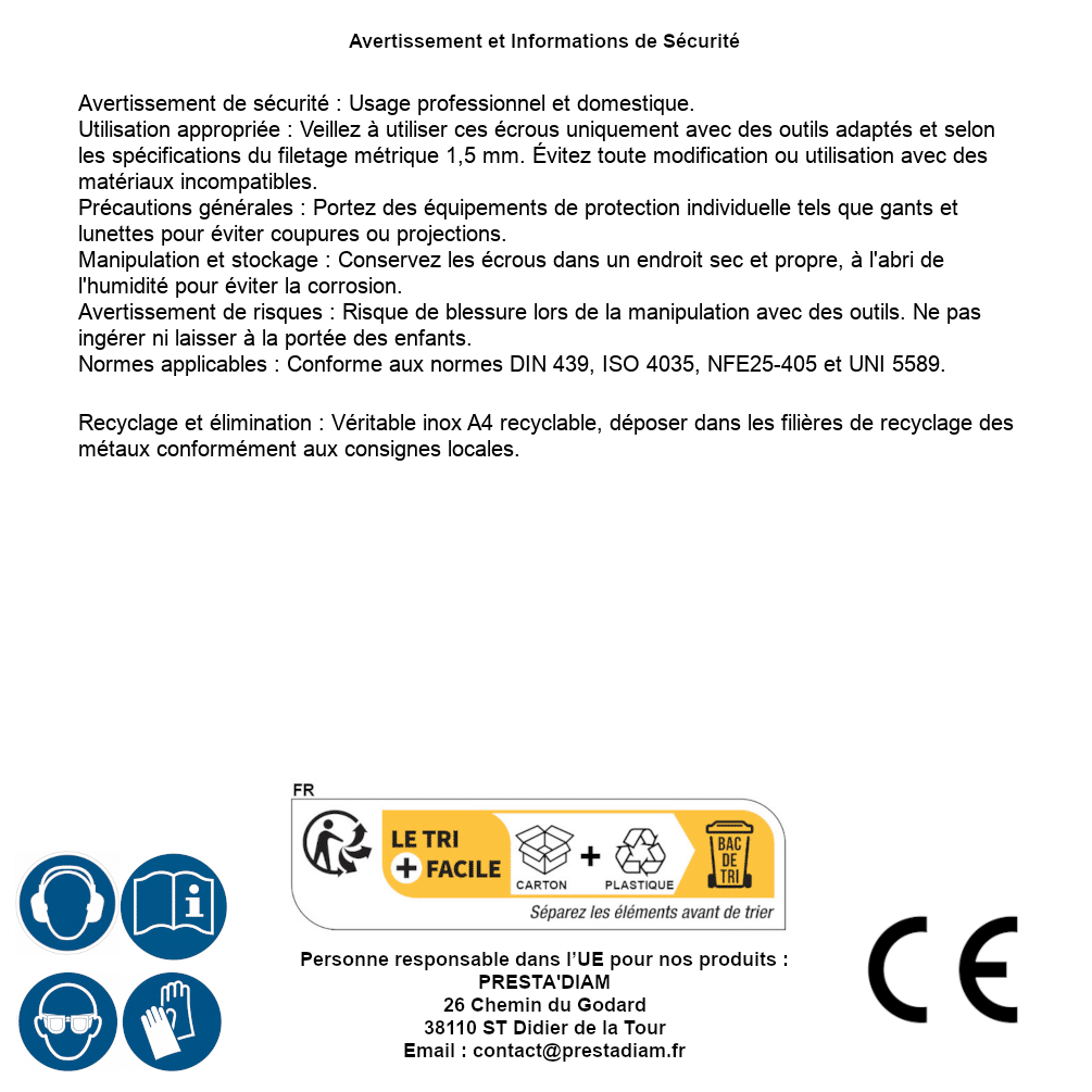 | AVERTISSEMENT et SECURITE | Identification de la personne responsable dans l’UE : Nom : PRESTA'DIAM. Adresse : 26 Chemin du Godard, 38110 ST Didier de la Tour (France). Email : contact@prestadiam.fr. |