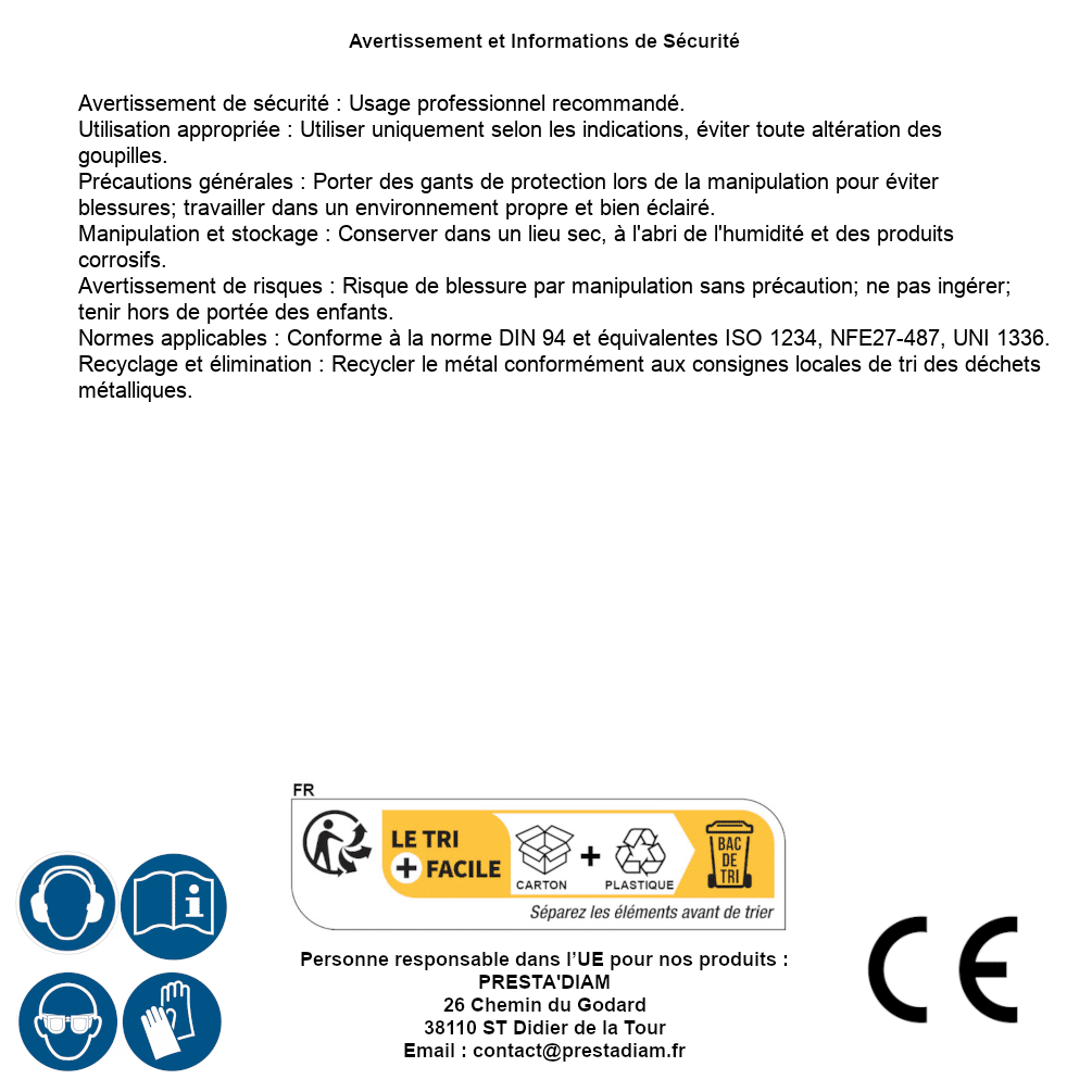 | AVERTISSEMENT et SECURITE | Identification de la personne responsable dans l’UE : Nom : PRESTA'DIAM. Adresse : 26 Chemin du Godard, 38110 ST Didier de la Tour (France). Email : contact@prestadiam.fr. |