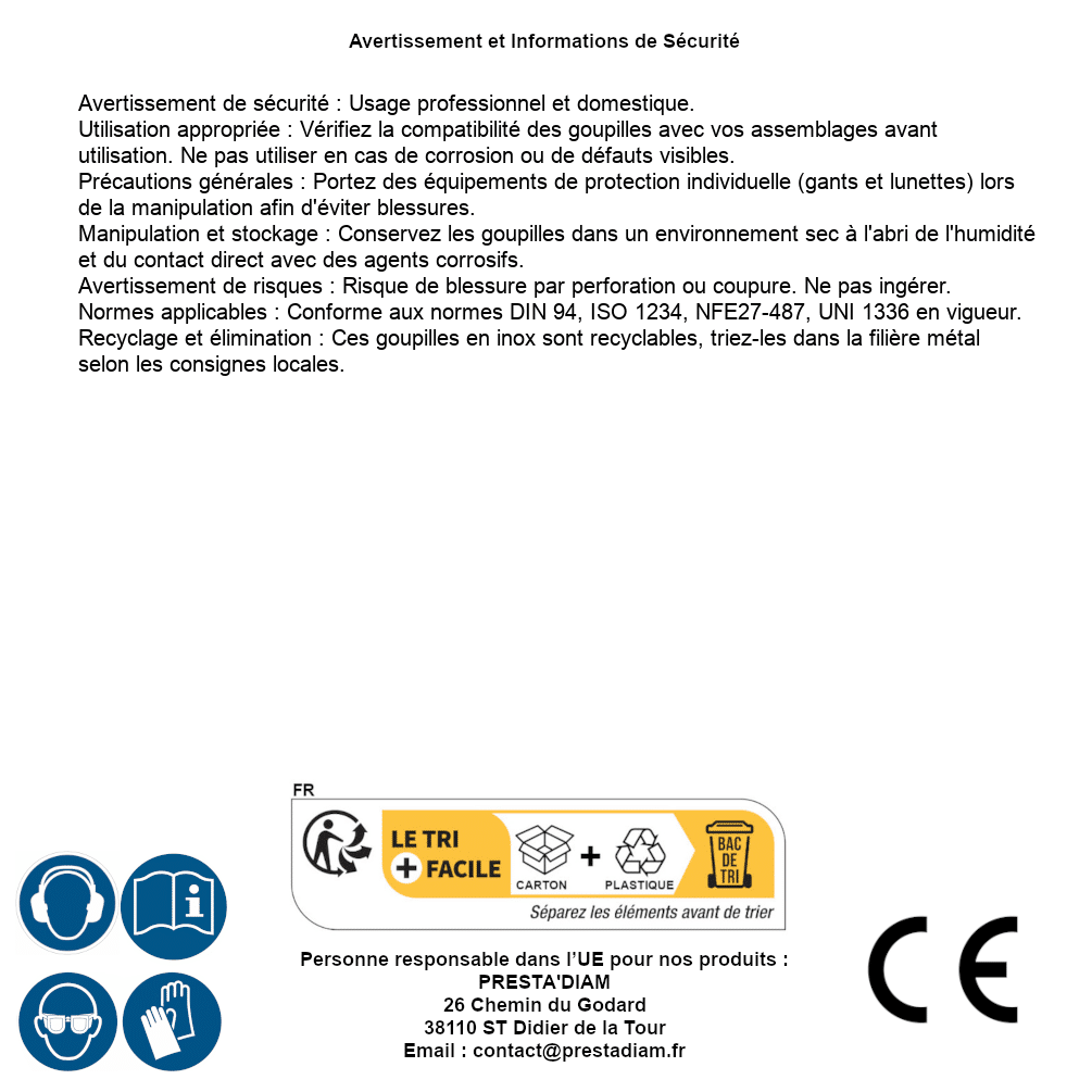 | AVERTISSEMENT et SECURITE | Identification de la personne responsable dans l’UE : Nom : PRESTA'DIAM. Adresse : 26 Chemin du Godard, 38110 ST Didier de la Tour (France). Email : contact@prestadiam.fr. |