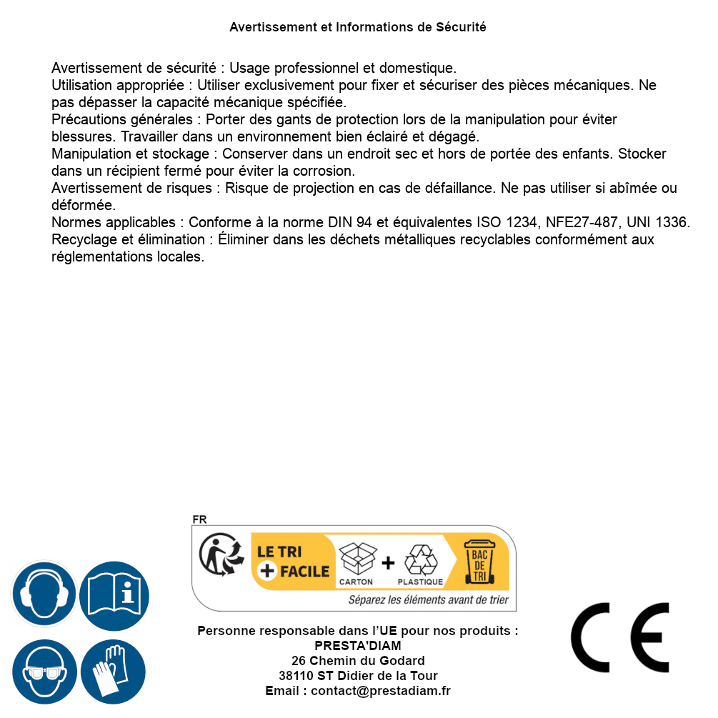 | AVERTISSEMENT et SECURITE | Identification de la personne responsable dans l’UE : Nom : PRESTA'DIAM. Adresse : 26 Chemin du Godard, 38110 ST Didier de la Tour (France). Email : contact@prestadiam.fr. |