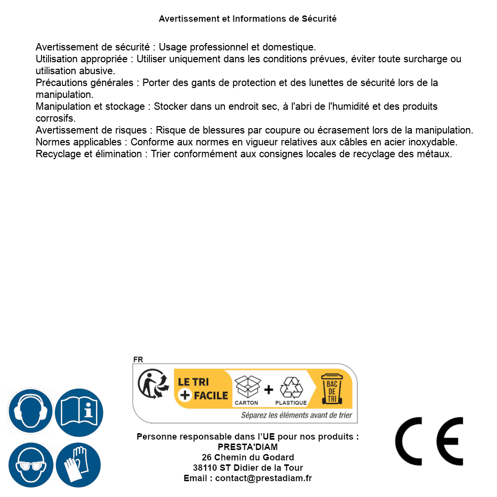 | AVERTISSEMENT et SECURITE | Identification de la personne responsable dans l’UE : Nom : PRESTA'DIAM. Adresse : 26 Chemin du Godard, 38110 ST Didier de la Tour (France). Email : contact@prestadiam.fr. |