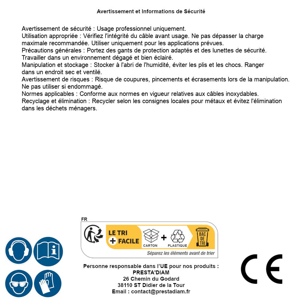 | AVERTISSEMENT et SECURITE | Identification de la personne responsable dans l’UE : Nom : PRESTA'DIAM. Adresse : 26 Chemin du Godard, 38110 ST Didier de la Tour (France). Email : contact@prestadiam.fr. |