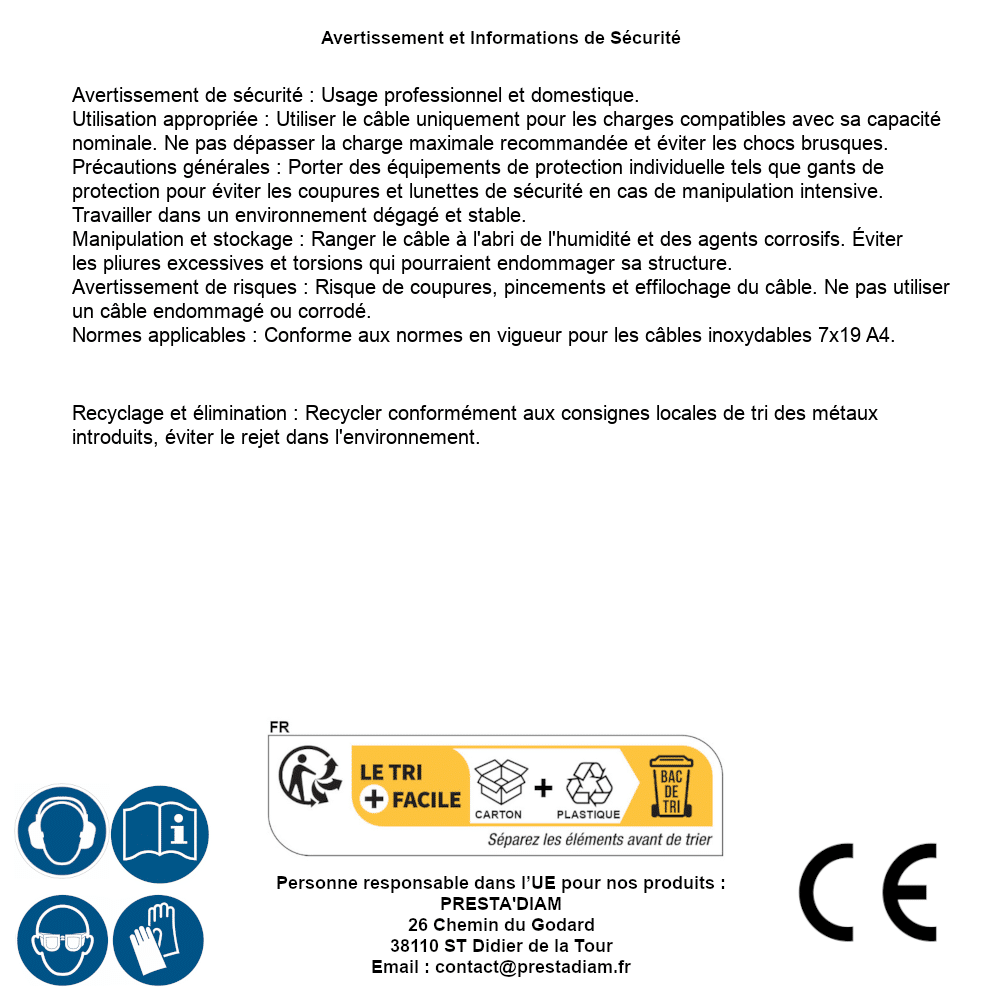 Ce câble est idéal pour les systèmes de levage, les garde-corps, les haubans, les installations marines, et toutes applications nécessitant un câble inox flexible et résistant. Il est recommandé de vérifier la compatibilité avec les accessoires de fixation et de respecter les consignes de sécurité lors de l'installation.