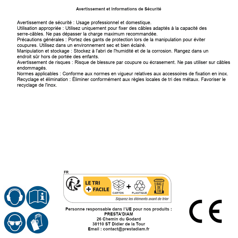 | AVERTISSEMENT et SECURITE | Identification de la personne responsable dans l’UE : Nom : PRESTA'DIAM. Adresse : 26 Chemin du Godard, 38110 ST Didier de la Tour (France). Email : contact@prestadiam.fr. |