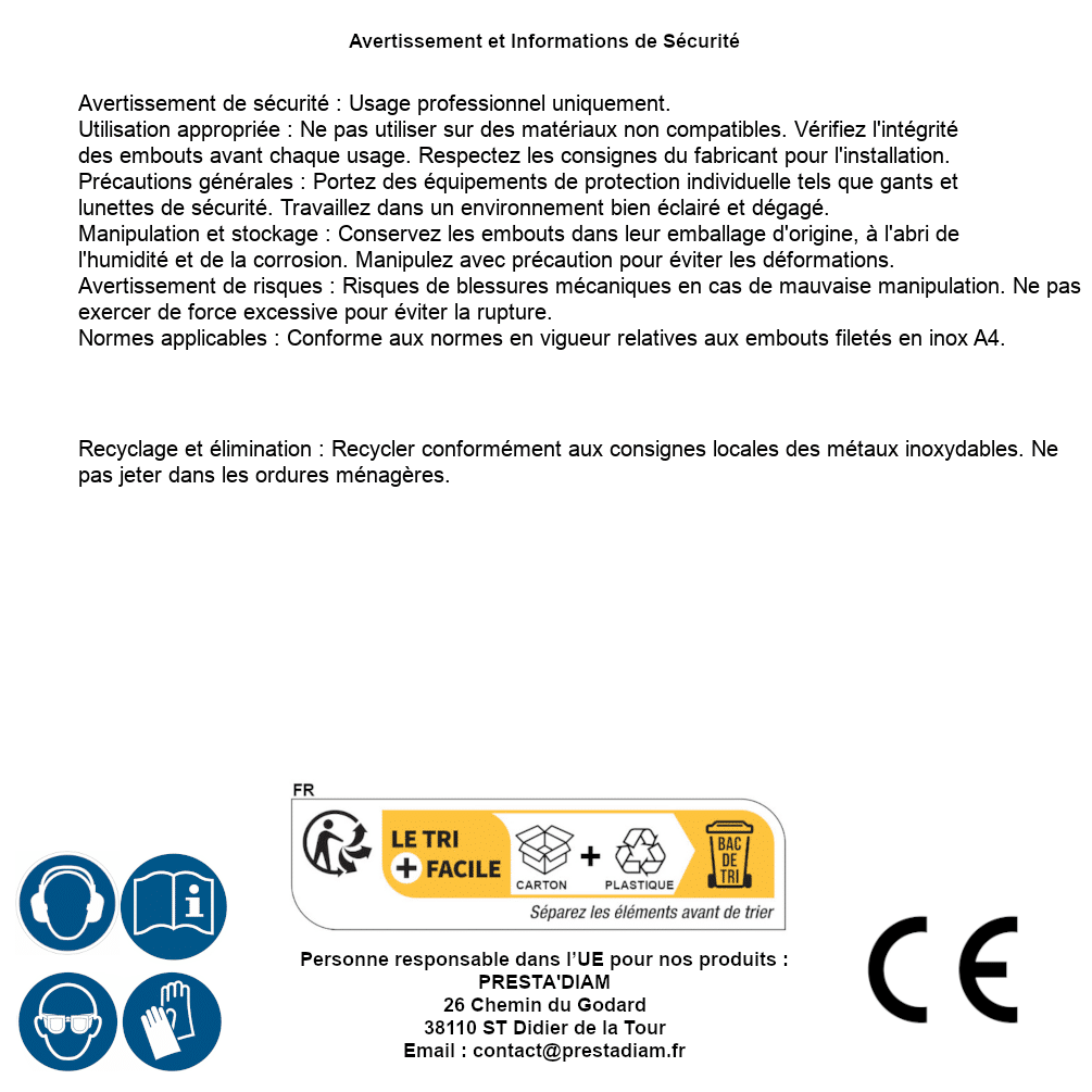 | AVERTISSEMENT et SECURITE | Identification de la personne responsable dans l’UE : Nom : PRESTA'DIAM. Adresse : 26 Chemin du Godard, 38110 ST Didier de la Tour (France). Email : contact@prestadiam.fr. |
