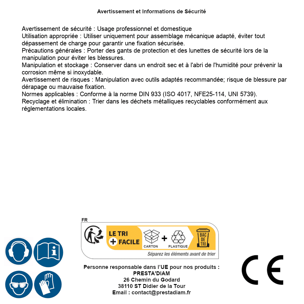 | AVERTISSEMENT et SECURITE | Identification de la personne responsable dans l’UE : Nom : PRESTA'DIAM. Adresse : 26 Chemin du Godard, 38110 ST Didier de la Tour (France). Email : contact@prestadiam.fr. |