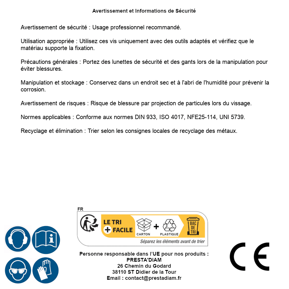 | AVERTISSEMENT et SECURITE | Identification de la personne responsable dans l’UE : Nom : PRESTA'DIAM. Adresse : 26 Chemin du Godard, 38110 ST Didier de la Tour (France). Email : contact@prestadiam.fr. |