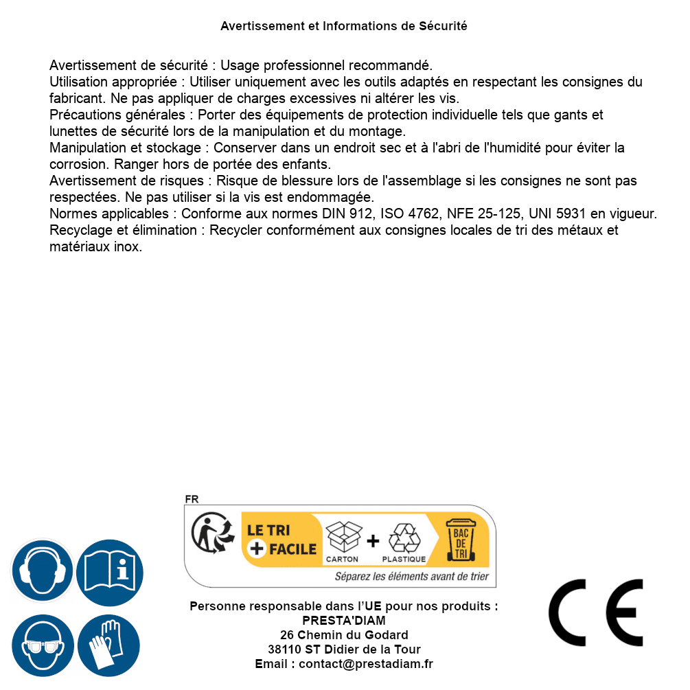 | AVERTISSEMENT et SECURITE | Identification de la personne responsable dans l’UE : Nom : PRESTA'DIAM. Adresse : 26 Chemin du Godard, 38110 ST Didier de la Tour (France). Email : contact@prestadiam.fr. |