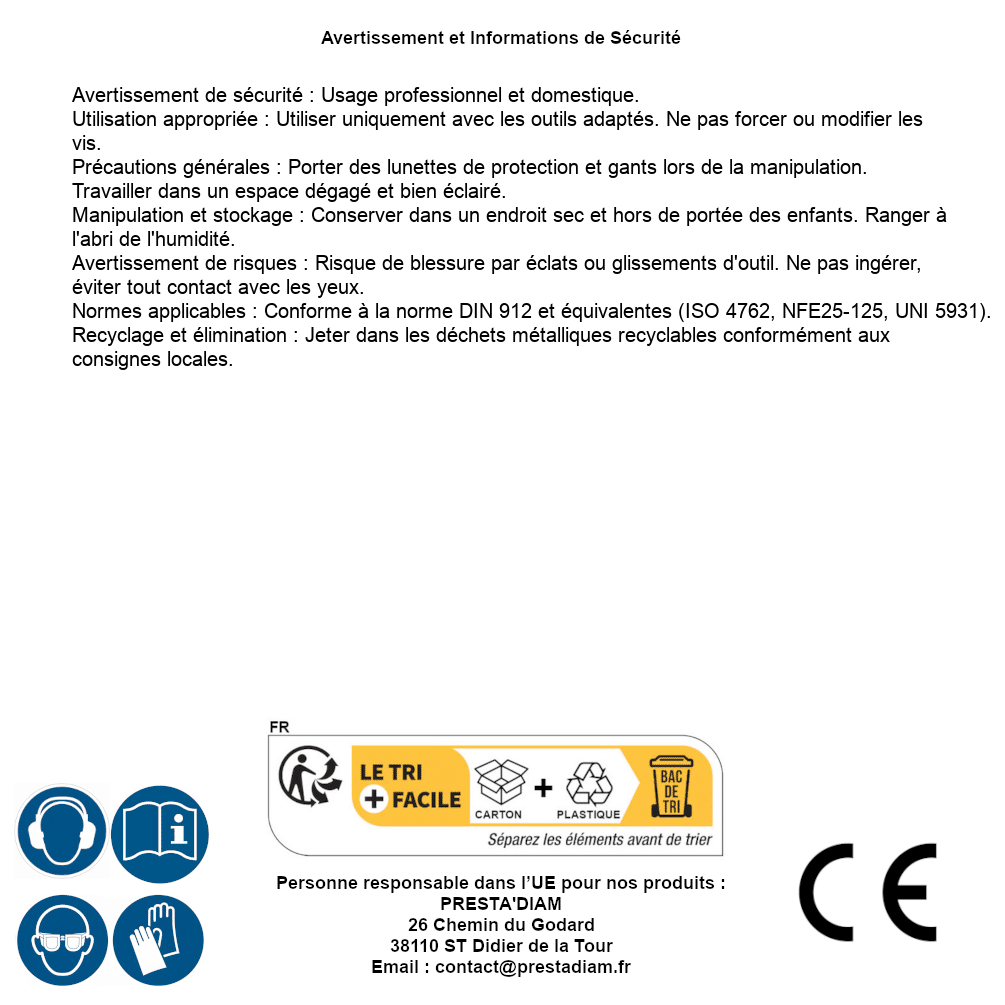 | AVERTISSEMENT et SECURITE | Identification de la personne responsable dans l’UE : Nom : PRESTA'DIAM. Adresse : 26 Chemin du Godard, 38110 ST Didier de la Tour (France). Email : contact@prestadiam.fr. |